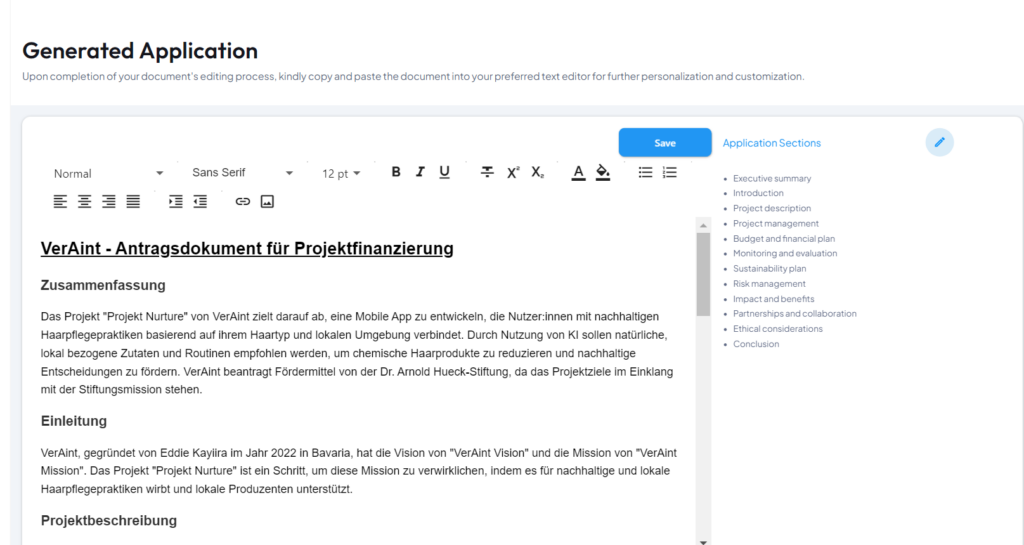 The application generation is user-friendly. Users can fill in project details, target funder information, and financial details. The process involves navigating through different pages, selecting document sections, and generating applications. Additionally, there is a prefilling details when starting from a recommended organization.