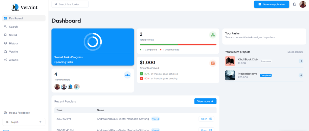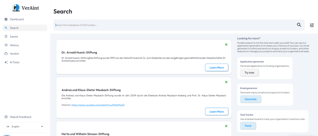 VerAInt assists in the fundraising process by enabling NGOs to search for potential funders and generate grant applications. It provides tools for finding funders, creating grant application documents, and streamlining the funding acquisition process.