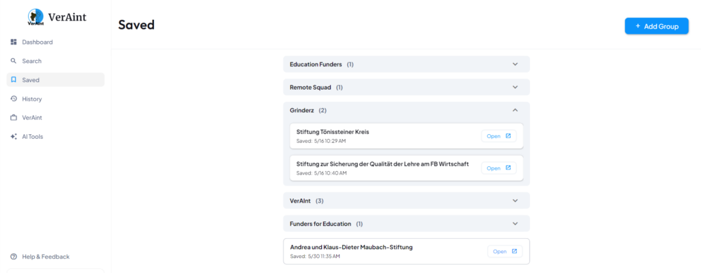 VerAInt has the “funders page” that contains a list of organizations available in the funders database. The feature provides the ability to filter organizations based on criteria, including text queries, state, organization priority, and active status. funder’s focus areas and preferences, the filtering options helps users may be able to narrow down their search based on certain criteria